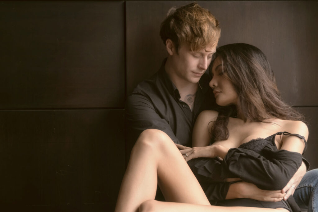 пара сидит в обнимку с закрытыми глазами